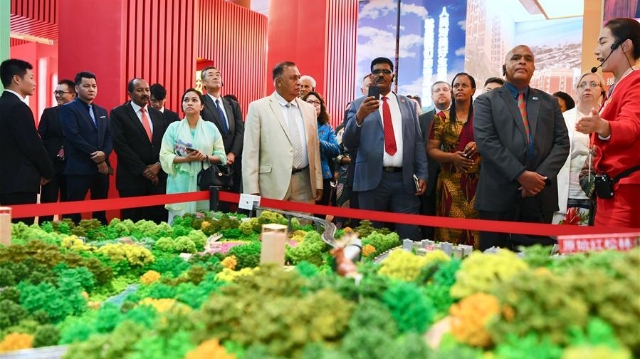 Des ambassadeurs et diplomates étrangers et des représentants d'organisations internationales visitent une grande exposition consacrée à des réalisations dans le cadre des commémorations du 70e anniversaire de la fondation de la République populaire de Chine au Centre des expositions de Beijing, le 25 septembre 2019.