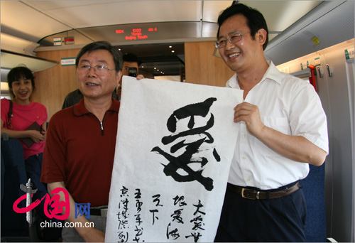 Wang Yongping, porte-parole du ministère chinois des Chemins de fer a rédigé spécialement une calligraphie à bord du nouveau train interurbain Beijing-Tianjin.