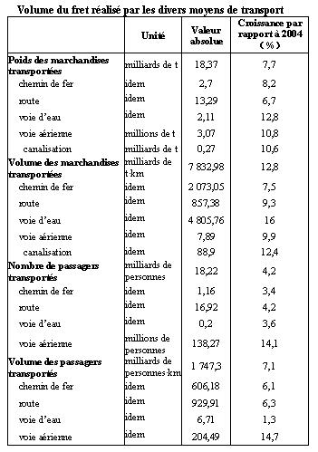 Les transports, l’entreposage, les postes et télécommunications ont réalisé une valeur ajoutée de 1,38 billion de yuans, soit 12,4 % de plus qu'en 2004.