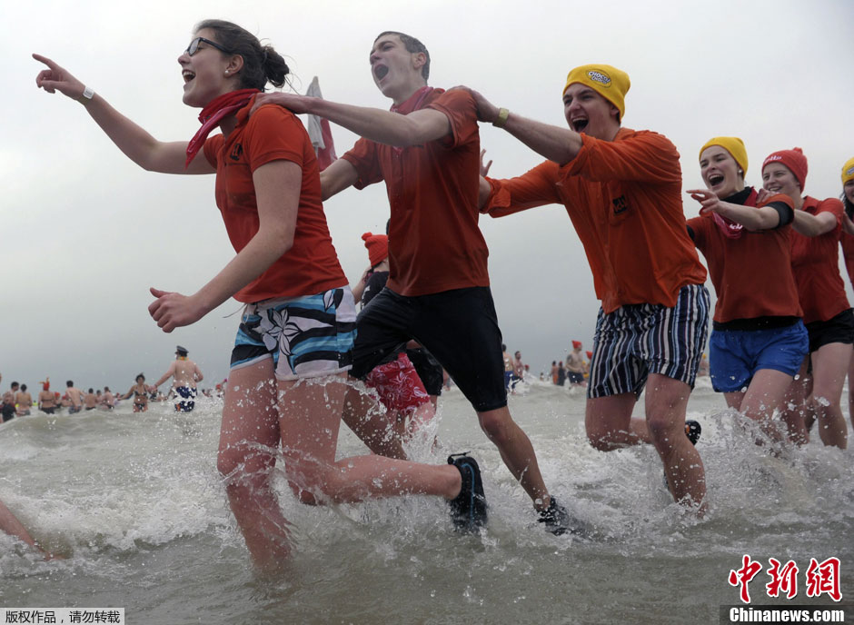 当地时间1月5日,比利时奥斯坦德,近千名冬泳爱好者在北海参加新年畅游活动。