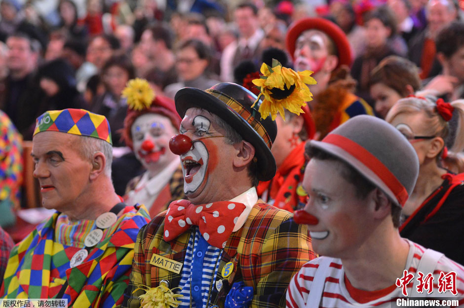 当地时间2月3日,英国伦敦,人们化妆成小丑聚集在教堂,为英国“小丑之父”约瑟夫·格里马尔迪举办纪念会。