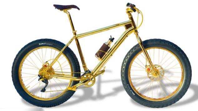 Selon le quotidien britannique Daily Mail, la société californienne The House of Solid Gold a mis en vente un vélo tout terrain recouvert d'une couche d'or 24 carats à un million de dollars. Ce vélo construit à la main est par ailleurs orné de 600 diamants noirs de 6 carats et de 500 diamants bleus de 4,5 carats. La selle est en cuir de crocodile et la gourde est recouverte d'or et enveloppée dans une peau séchée de raie rouge.
