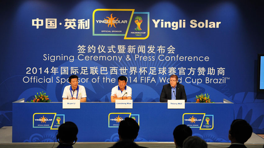 Le fabricant de systèmes photovoltaïques chinois Yingli Solar, fondé en 1987 et côté à la Bourse de New York depuis 2007, avait parrainé la Coupe du monde de football 2010 et est à nouveau présent au Brésil cette année. C'est en réalité la seule entreprise chinoise qui a participé à deux éditions successives du Mondial.