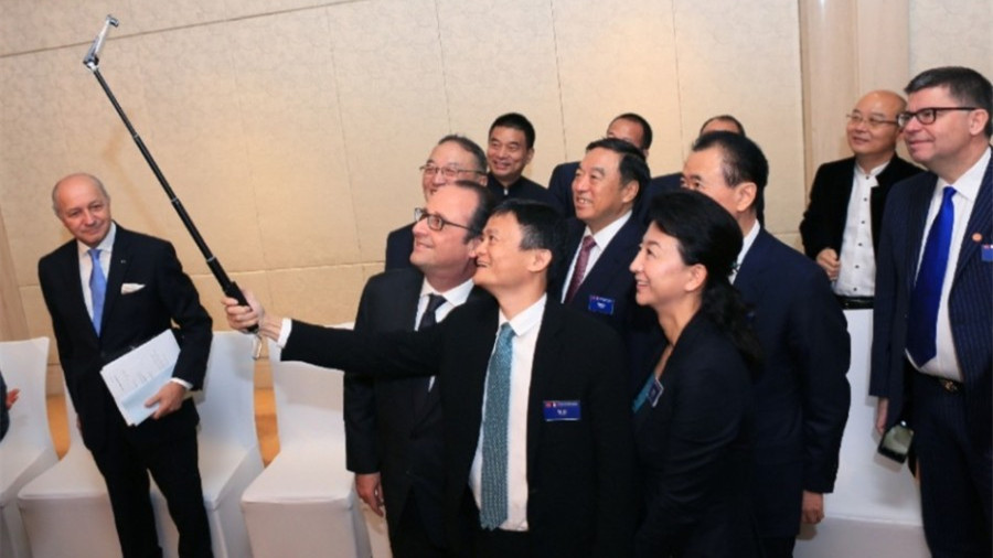 Premier rang de gauche à droite : le président François Hollande ; Ma Yun (Jack), président du groupe Alibaba ; Cheng Hong, secrétaire en chef du club des entrepreneurs.