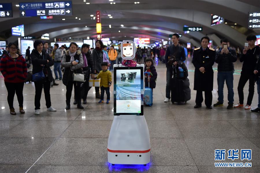 Des voyageurs interagissent avec le robot Xiao Lu à la gare du Sud de Guangzhou. Photos prises le 1er février.