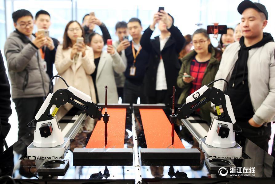 ET, un robot à intelligence artificielle d'AliCloud, fait une démonstration de ses compétences en calligraphie en écrivant des couplets traditionnels de la Fête du Printemps pour les employés d'Alibaba dans le parc Xixi d'Alibaba à Hangzhou, capitale de la province du Zhejiang (Est de la Chine) lundi. Les employés ont été invités à « réveiller » ET, à lui parler, puis ils ont obtenu des couplets de la Fête du printemps sur mesure, écrits en utilisant les fonctions de reconnaissance faciale et d'analyse vocale du robot.