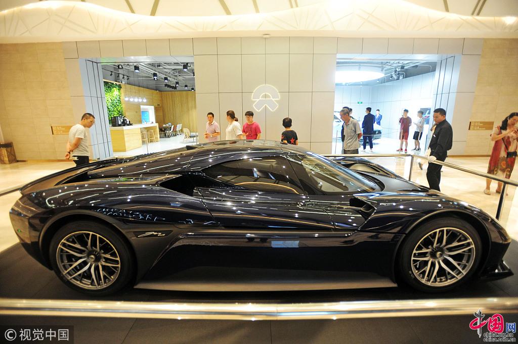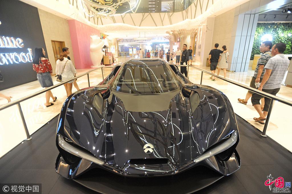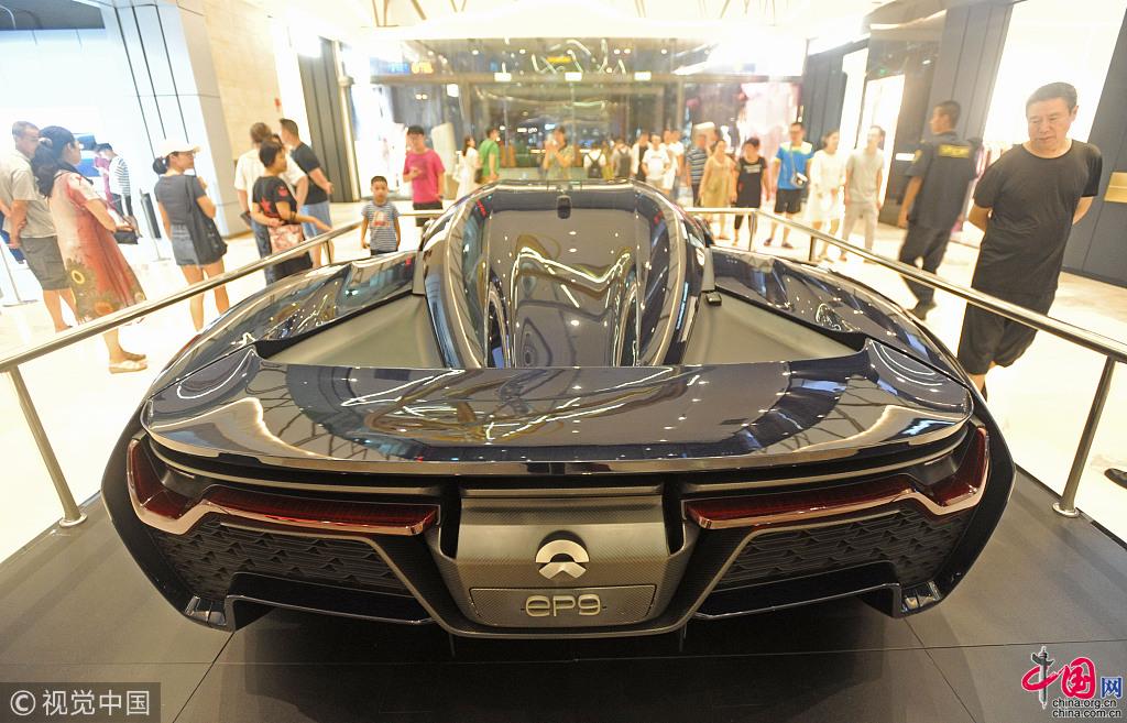 Une NIO EP9 bleu foncé exposé dans un centre commercial à Wuhan. Elle appartiendrait à Lei Jun (Xiaomi) et coûterait près de 1,48 million de dollars.