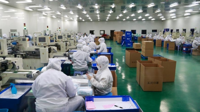 Des ouvriers fabriquent des masques faciaux dans une usine de Shanghai (est de la Chine), le 4 février 2020. La totalité des 17 entreprises de la ville qui fabriquent des masques faciaux ont repris leur production et augmentent leur capacité de production. (Tang Yanjun / China News Service)