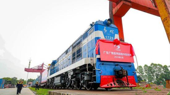 Un train de marchandises Guangzhou-Russie transportant 41 conteneurs arrive dans le district de Baiyun de la ville de Guangzhou, capitale de la province du Guangdong (sud de la Chine), le 19 mai 2020. C’était le premier train de marchandises à revenir depuis l'ouverture de la ligne de train de marchandises Chine-Europe à Guangzhou en août 2016.