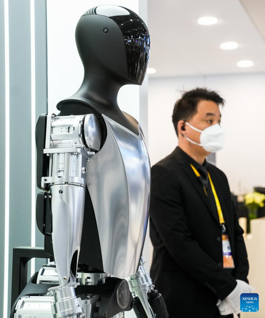 Photo prise le 5 novembre 2022 montre un bot Tesla exposé dans la zone d’exposition automobile de la 5e Exposition internationale des importations de Chine (CIIE) au Centre national des expositions et des congrès de Shanghai (est de la Chine), le 5 novembre 2022