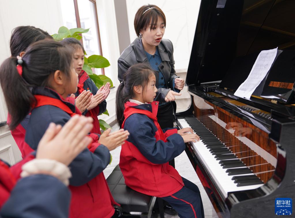 Des élèves de primaire de l'école centrale du bourg de Luoshe du district de Deqing, à Huzhou, dans la province du Zhejiang (est de la Chine), jouent du piano dans la salle d'exposition de la Cité du Piano. Photo prise le 23 mars.