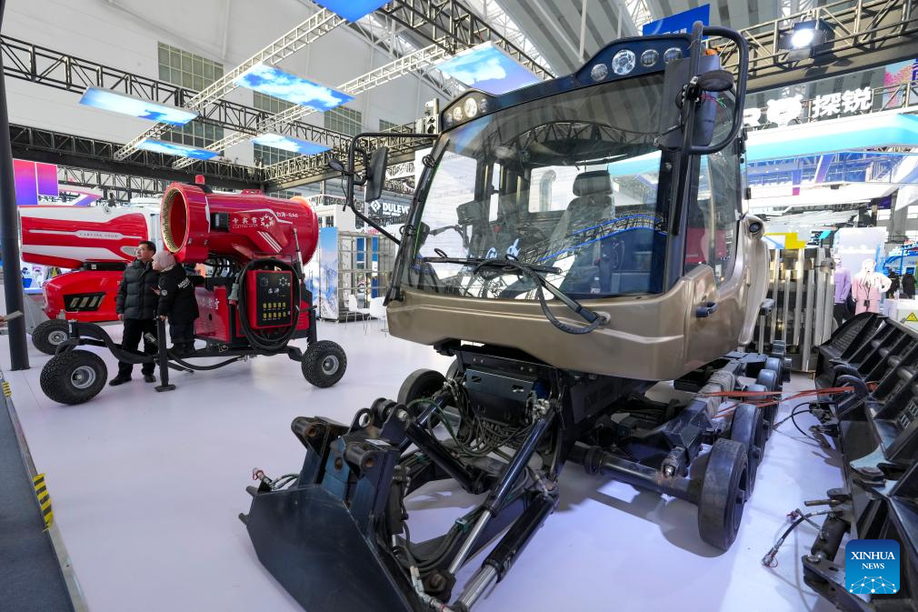 Une dameuse est exposée à l'Exposition internationale de l'économie hivernale de Harbin, dans la province du Heilongjiang (nord-est), le 6 janvier 2026. L'exposition de trois jours a débuté le 6 janvier, mettant en avant les principales réalisations dans le secteur de l'économie hivernale. (Xinhua/Wang Song)