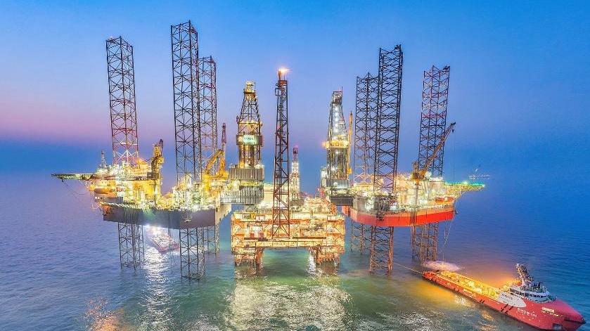 Photo aérienne prise par un drone le 24 février 2026, montrant une plateforme pétrolière et gazière offshore dans le champ pétrolier de Bohai. Les usines et entreprises chinoises ont repris le travail mardi après les congés de la fête du Printemps. (Photo : Du Penghui/Xinhua)