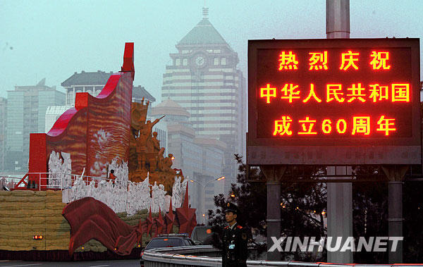 Les chars de carnaval colorés illustrant les réalisations de la Chine au cours des six dernières décennies sur le long de l'avenue Chang'an, pour fêter le 60e anniversaire de la République populaire de Chine (RPC).