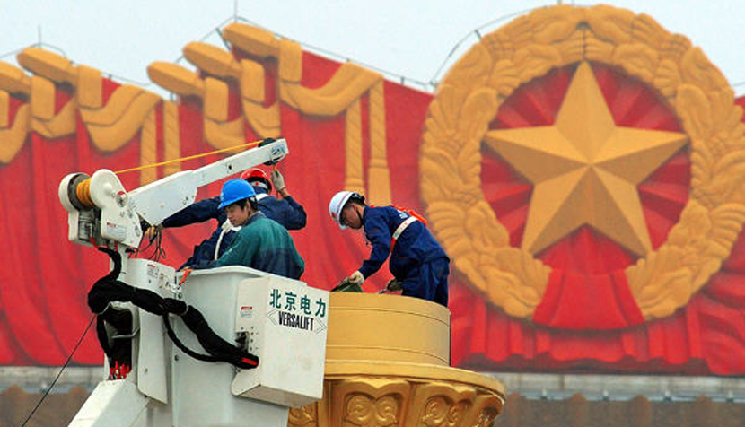 Beijing : installation du matériel de tir des feux d'artifice sur la place Tian'anmen