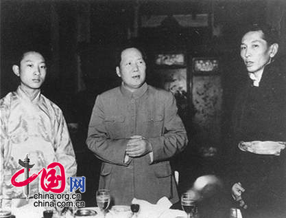 Photo-document : Mao Zedong donne un banquet en l'honneur du Banquen Erdeni (à g.) et de Ngapoi Ngawang Jigme.