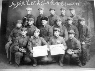 En 1960, une photo de Lei Feng (deuxième à droite au premier rang) avec ses camarades après une représentation à Yingkou.