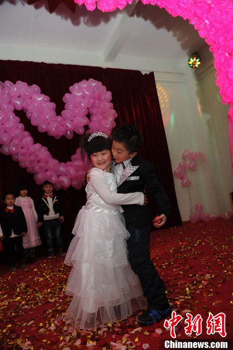 Plus de cent jeunes enfants de cinq ans se sont mariés vendredi dernier à Zhengzhou, dans la province du Henan, à l'occasion d'un mariage de groupe factice organisé par une école maternelle, une activité qui inquiète certains experts dès lors qu'on enseigne bien trop tôt aux enfants le fonctionnement des relations entre adultes.