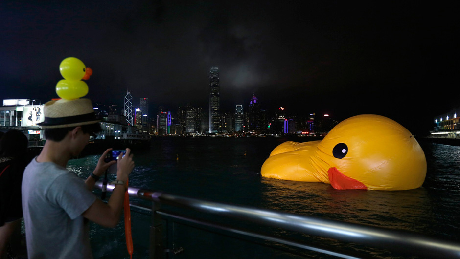 2013年5月14日,香港,由于多处破损,小黄鸭在维多利亚港呆了12天后,因漏气“躺倒”在维多利亚港,成了一张“鸭蛋饼”。这只高16.5米的充气黄色橡皮鸭的香港之旅计划从5月2日延续到6月9日。
