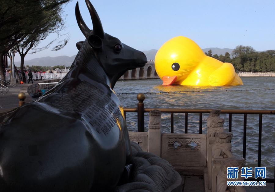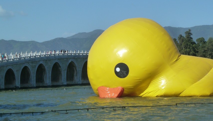Le 10 octobre, le bureau météorologique de Beijing a émis une alerte bleue aux grands vents. Sous l'influence d'une masse d'air froid, un vent du nord de force 5 à 6 était annoncé dans la ville. Pour éviter les éventuels dégâts que peuvent entraîner ces vents puissants, la direction du parc du palais d'Eté a pris des mesures d'urgence et a fait dégonfler le canard géant, pour le protéger. Le canard sera par la suite regonflé et exposé aux visiteurs du parc.