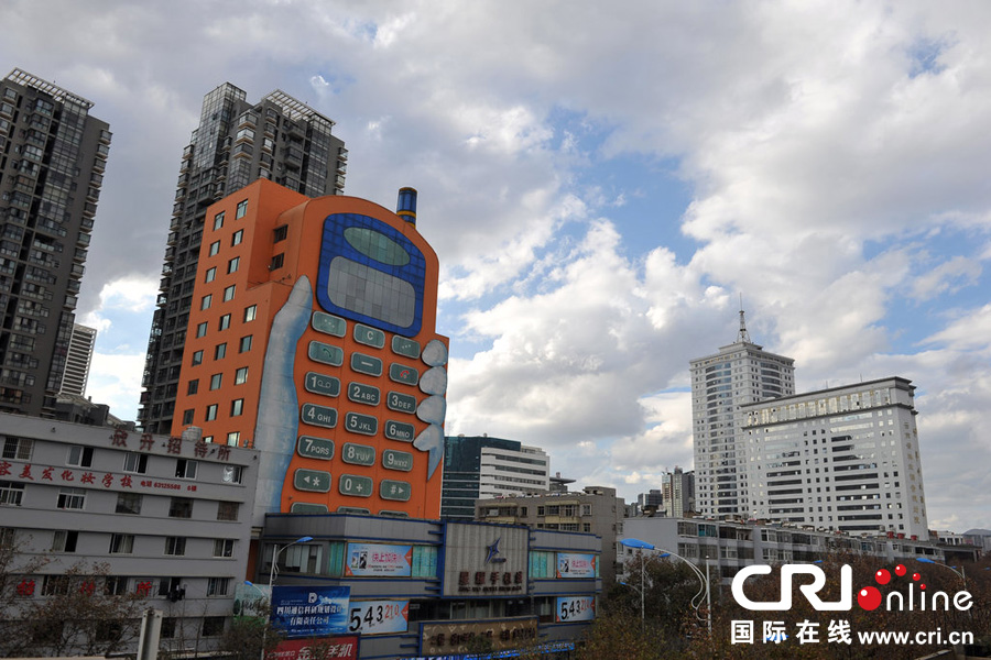 Photo prise le 16 novembre, un bâtiment en forme de téléphone portable à Kunming, dans le Yunnan.