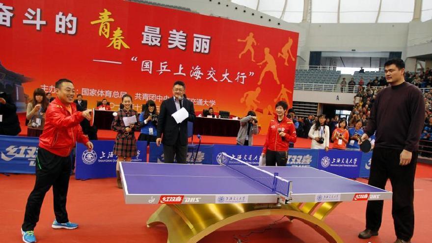 Le 3 décembre, l'équipe nationale de tennis de table et son entraîneur Liu Guoliang se sont rendus à l'Université Jiaotong de Shanghai,pour participer à une série d'activités. Yao Ming, qui assistait à cette visite, en a profité pour se mesurer aux champions nationaux dans leur propre discipline.