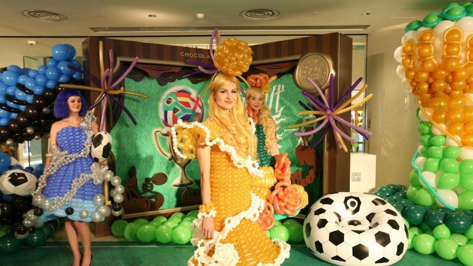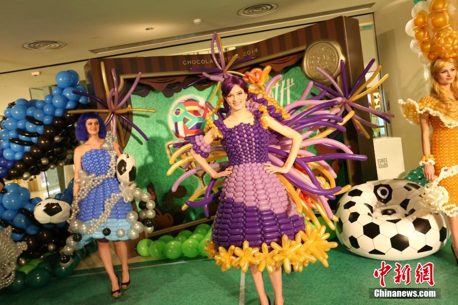 Photo prise le 18 mai à Chongqing, les mannequins posent dans des robes faites de ballons gonflables. A l'approche de la Coupe du monde, la ville de Chongqing a organisé une série d'événements afin d'inviter les habitants locaux à se mettre dans l'ambiance avant l'inauguration de ce grand festin sportif. Outre les robes, le trophée du mondial, des ballons et des chaussures de football avait également été fabriqués en ballons gonflables pour l'occasion.
