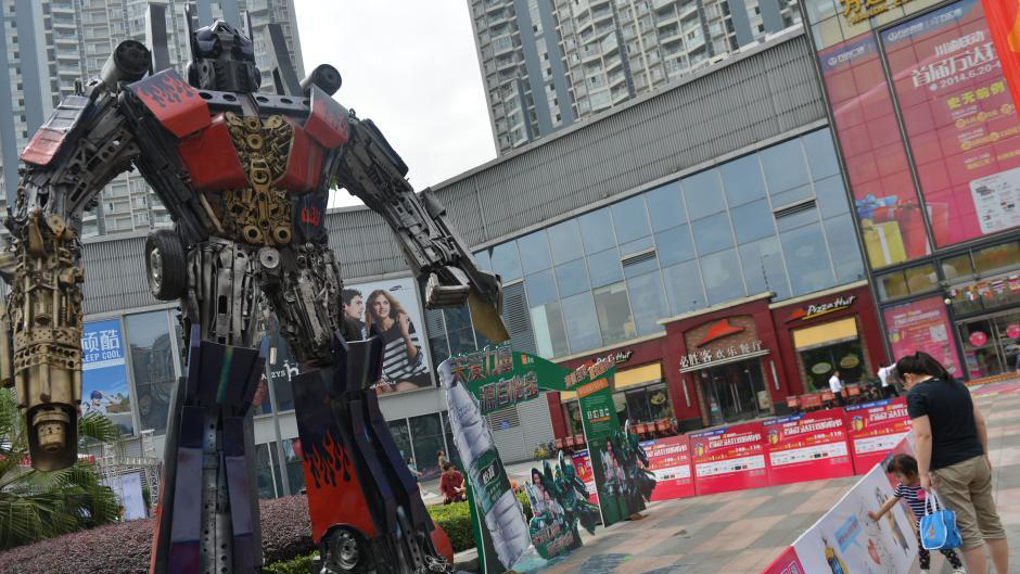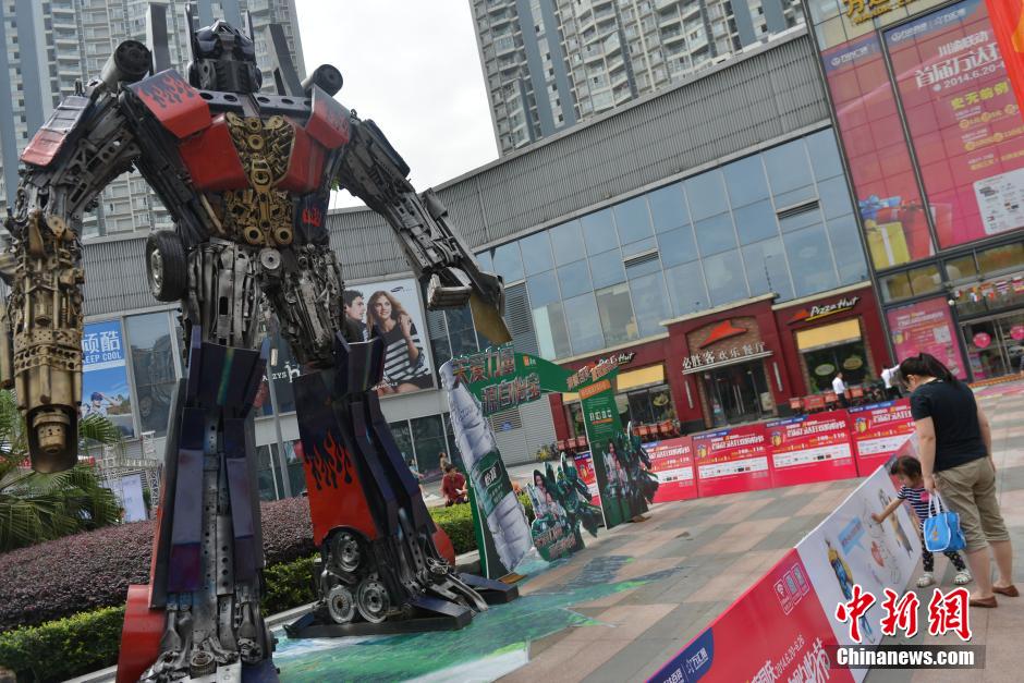 Une statue d'Optimus Prime, le héros des films Transformers, composée de pièces de voiture recyclées a été exposée dans la ville chinoise de Chengdu (centre-ouest).
