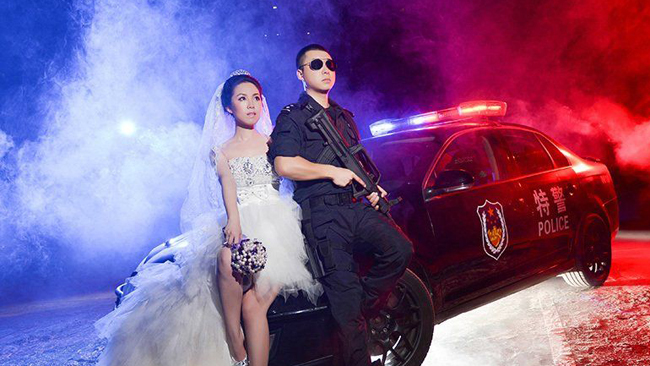 - Hou Weilin, 29 ans et membre de la brigade d'intervention spéciale du bureau de la sécurité publique de Chongqing, a amené sa fiancée en robe de mariée sur le site d'entraînement de l'équipe le temps d'une séance photo.