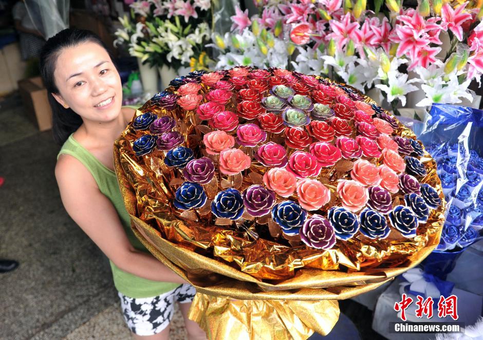 A l'approche de la fête de Qixi, la « Saint-Valentin chinoise », un fleuriste de Chongqing dans la province du Sichuan propose à ses clients les plus fortunés un bouquet particulier constitué de 99 roses en or. Celles-ci ont l'avantage de ne jamais faner !