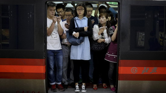 Des banlieusards avec leurs smartphones se serrent à l'intérieur d'un métro pendant une heure de pointe à Beijing, le lundi 22septembre 2014.