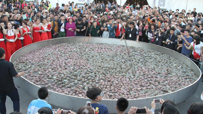 Un festin géant de crabes cuits à la vapeur a attiré l'attention du public dans le comté de Panshan, dans la province du Liaoning (nord-est de la Chine), le 12 septembre 2015. La confection de ce repas était une mesure visant à stimuler le tourisme local. Une demande a été soumise au Guinness World Records pour le chaudron utilisé lors de ce festin, en tant que plus gros instrument de cuisson du monde. Le chaudron est d'un diamètre de 6,6 mètres, d'une hauteur de 1,5 mètre, et pèse 7000 kg.
