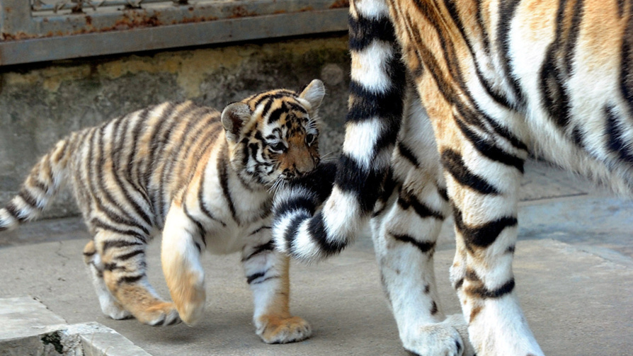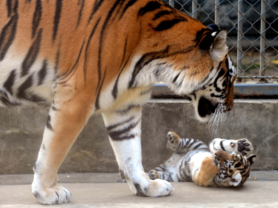 Un bébé Tigre de Sibérie s'amuse avec sa mère dans un zoo à Suzhou, dans la province chinoise du Jiangsu (est), le 18 octobre 2015.