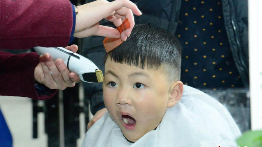 Un coiffeur coupe les cheveux d'un enfant dans un salon de coiffure de Changchun, capitale de la province du Jilin (Nord-est de la Chine), le 10 mars 2016. Ce jour-là a eu lieu la fête traditionnelle du « Dragon qui relève la tête », ou Festival Longtaitou, qui tombe chaque année le deuxième jour du deuxième mois lunaire (le 10 mars, en 2016). A cette occasion, les Chinois aiment se faire couper les cheveux pour prendre un bon départ dans l'année. [Photo / Chinanews.com]