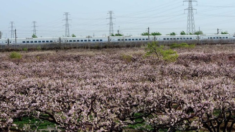 Photos prises le 7 avril à Tongzhou, à l'est de Beijing, le long d'une ligne de TGV bordée de nombreux pêchers en fleur.
