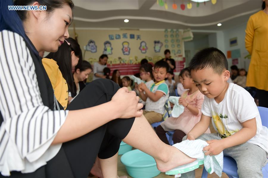 Ruan Tianyou (devant à droite) lave les pieds de sa mère dans son école maternelle de Hefei, capitale de la Province de l'Anhui (Est de la Chine), le 5 mai 2016. De nombreuses activités ont été organisées à Hefei pour la prochaine Fête des Mères, qui tombe le 8 mai cette année.
