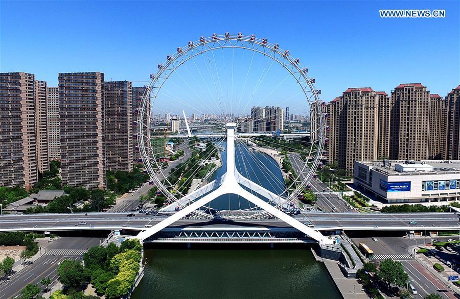 Photo prise le 24 juin 2016, montrant une grande roue sur la rivière Haihe à Tianjin, dans le Nord de la Chine.