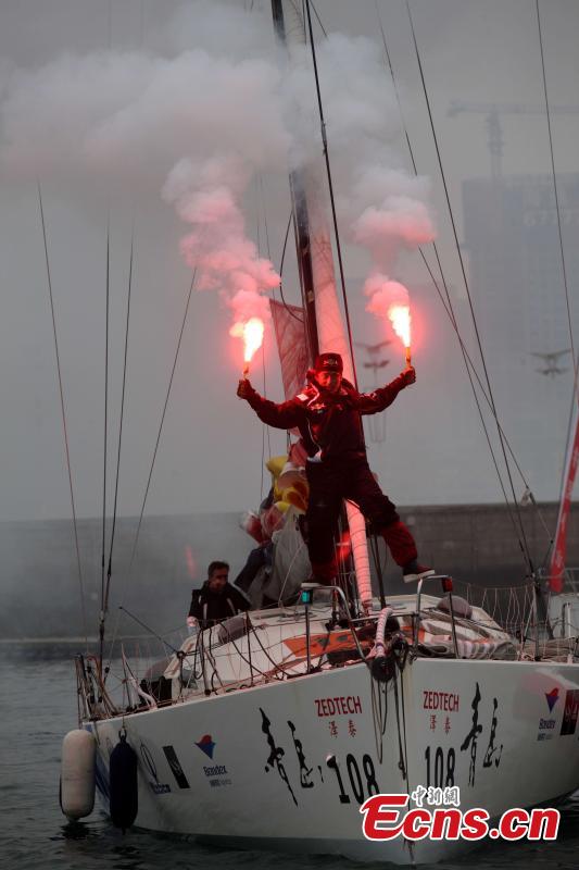 Le marin chinois Guo Chuan pilote le trimaran « Qingdao China » pour revenir à Qingdao, dans la province du Shandong, le 5 avril 2013, après avoir terminé un tour du monde non-stop en solo. Guo Chuan a battu un record du monde à la voile en parcourant 21 600 miles marins (40 000 km) autour du monde en 138 jours, en solitaire et sans escale, avec un voilier de 12 mètres de long sans moteur.