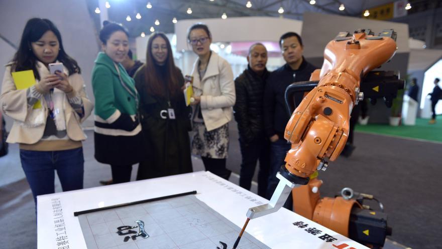 Un bras robotisé écrit de la calligraphie chinoise lors de la Semaine de la créativité et du design de Chengdu 2016 à Chengdu, capitale de la province du Sichuan (Sud-ouest de la Chine), vendredi 25 novembre. L'événement a attiré plus de 100 entreprises innovantes venant de Chine et de l'étranger. (Photo : China News Service / Zhang Lang)