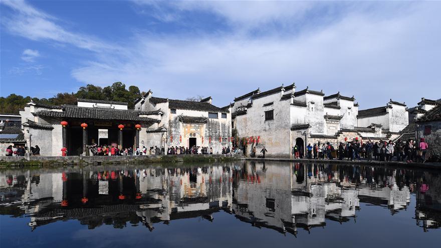 Des touristes visitent le Yuezhao, ou Étang de la Lune, à Hongcun, un village ancien situé dans le comté de Yixian de la ville de Huangshan, dans la province de l'Anhui (Est de la Chine), le 26 novembre 2016. (Xinhua / Chen Yehua)