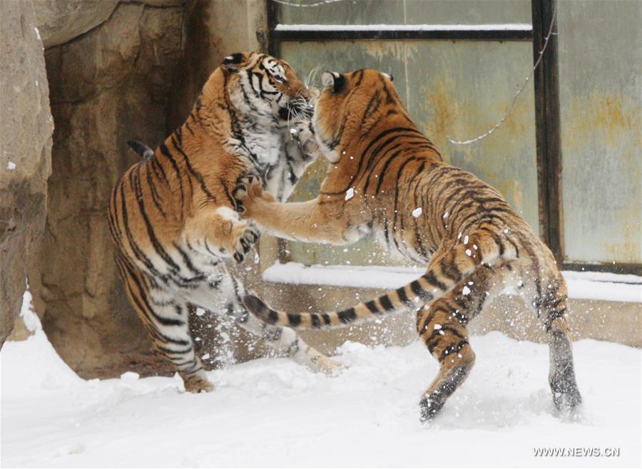 - Deux tigres de Sibérie jouent dans la neige dans un zoo de Yantai, dans la province du Shandong (Est de la Chine), le 22 février 2017. (Xinhua / Shen Jizhong)