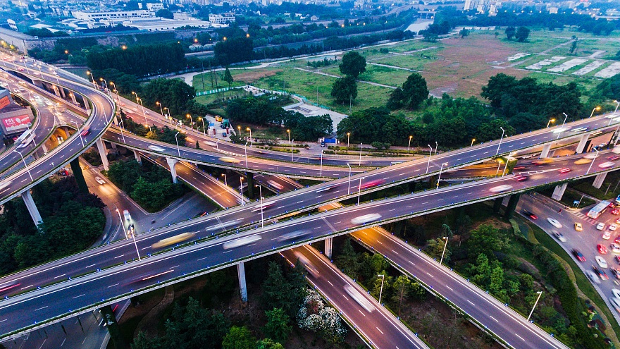 1. Une vue panoramique du pont autoroutier de Saihongqiao à Nanjing, capitale de la province du Jiangsu, le 11 juin 2017. Le pont autoroutier, d'une longueur totale de 10 kilomètres, d'une hauteur de 23 mètres et d'une largeur de 39 mètres, comporte 23 rampes d'accès et de sortie entrelacées de ponts.