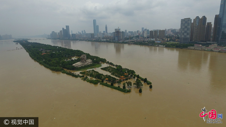 - Une vue de la zone touristique de l'île de l'Orange sous les eaux, à Changsha, dans la province du Hunan (centre), touchée par les inondations. Photo prise le 2e juillet.