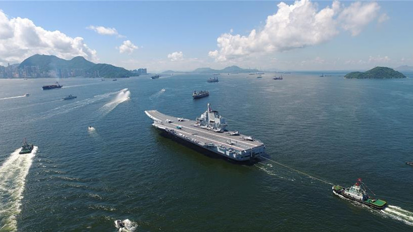 Le premier porte-avions chinois, le Liaoning, part après une visite de cinq jours dans la Région administrative spéciale de Hong Kong, dans le sud de la Chine, le 11 juillet 2017. Une cérémonie de départ a été organisée à la caserne Ngong Shuen Chau de la garnison de Hong Kong de l'Armée populaire de libération (APL) par le gouvernement de la Région administrative spéciale.