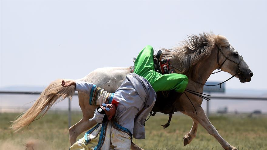 Un berger fait une démonstration devant des visiteurs sur la prairie à Xilinhot, dans la région autonome de Mongolie intérieure (nord de la Chine), le 2 juillet 2017. Les chevaux sont importants dans la culture mongole, qui possède plus de 300 mots pour designer les chevaux et 200 autres rien que pour leur couleur. Cependant, au fil des années, la moto avait eu raison de l'équitation. Le nombre de chevaux appartenant à des bergers dans la région était ainsi tombé de 2,4 millions en 1975 à moins de 700 000 en 2007. Et comme les chevaux destinés à la reproduction n'étaient pas rentables, beaucoup de familles ont vendu leurs montures et acheté des motos et des voitures. Pour préserver le cheval mongol en voie de disparition et transmettre la culture du cheval, des efforts de protection ont été faits. En 2011, la région a mis en place trois bases d'élevage pour chevaux mongols avec un investissement total de 18 millions de yuans (2,28 millions d'euros) par an pour préserver cette race. Ces efforts de protection ont été payants, car on a ainsi vu le nombre de chevaux en Mongolie intérieure augmenter de 25% en une décennie, atteignant 880 000 têtes l'année dernière. De plus, les diverses manifestations liées aux chevaux augmentent également dans la région.