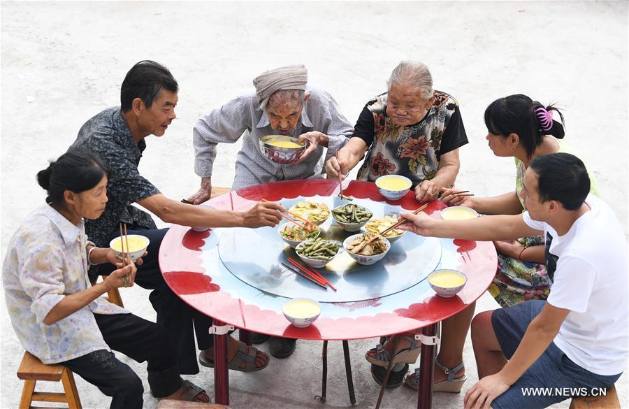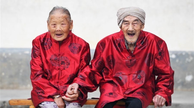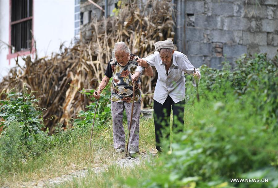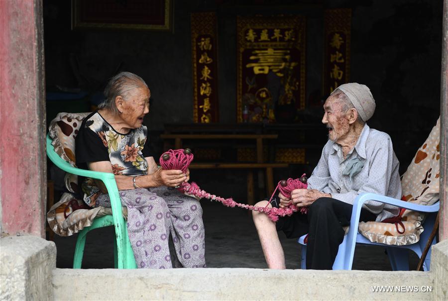 Xiang Yongshan (à droite) et sa femme, Wu Xi'an, posent pour la photo dans le village de Zaojiao du canton de Fengping, dans le comté de Fengjie de la municipalité de Chongqing (sud-ouest de la Chine), le 23 août 2017. M. Xiang, 100 ans, et Mme Wu, 101 ans, sont mariés depuis 81 ans.