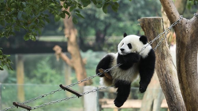 Deux pandas géants jouent au zoo de Chongqing (sud-ouest de la Chine), le 2 novembre 2017. (Photo / Xinhua)