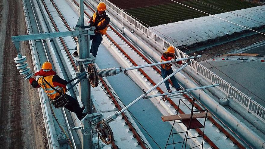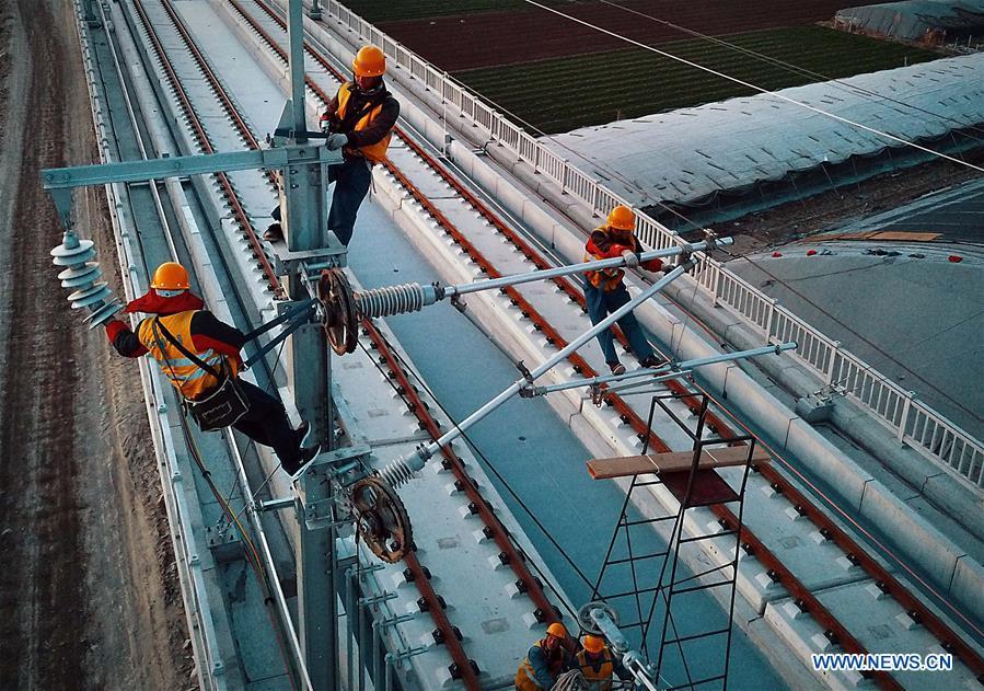 Des ouvriers installent le système de lignes aériennes de la liaison à grande vitesse Jinan-Qingdao dans la province du Shandong (est de la Chine), le 26 novembre 2017. Les travaux d'installation ont commencé depuis le 21 novembre. La ligne ferroviaire à grande vitesse devrait être mise en service fin 2018, et permettra alors de réduire le temps de trajet entre les deux villes à une heure.