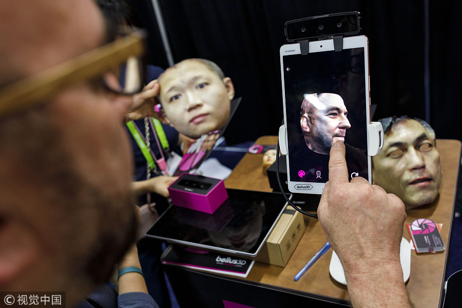 La Face Camera Pro de Bellus3D Inc effectue un scan tridimensionnel (3D) du visage d'un participant lors du CES Unveiled, le 7 janvier 2018 à Las Vegas. (Photo / VCG)