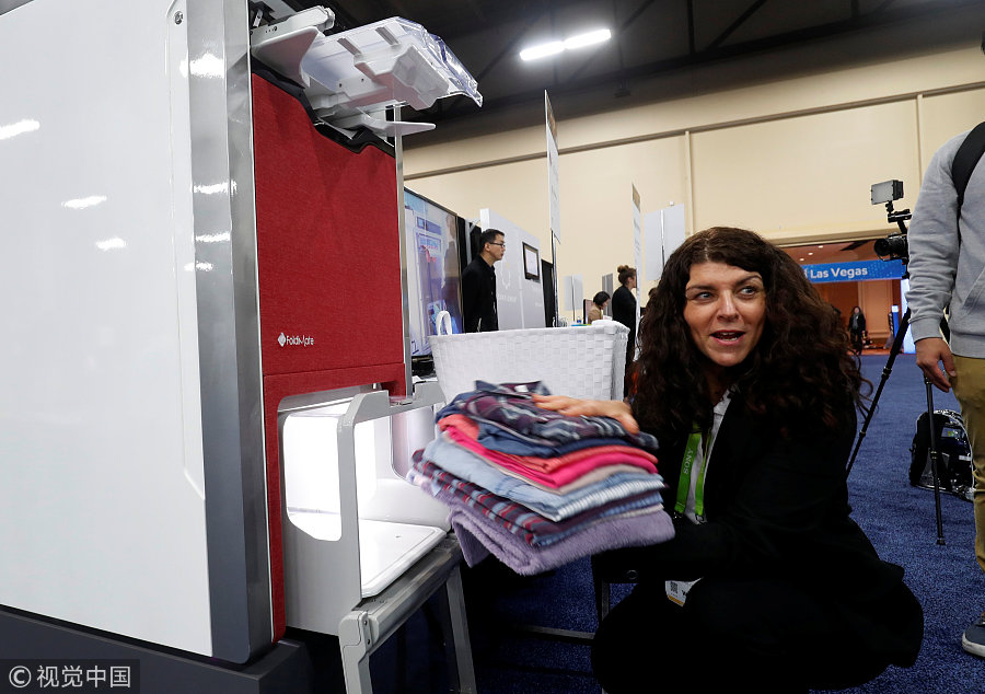 Debbie Cohen-Abravanel, directrice du marketing chez FoldiMate, prend du linge plié d'une plieuse automatique FoldiMate lors du CES Unveiled, le 7 janvier 2018 à Las Vegas. (Photo / VCG)